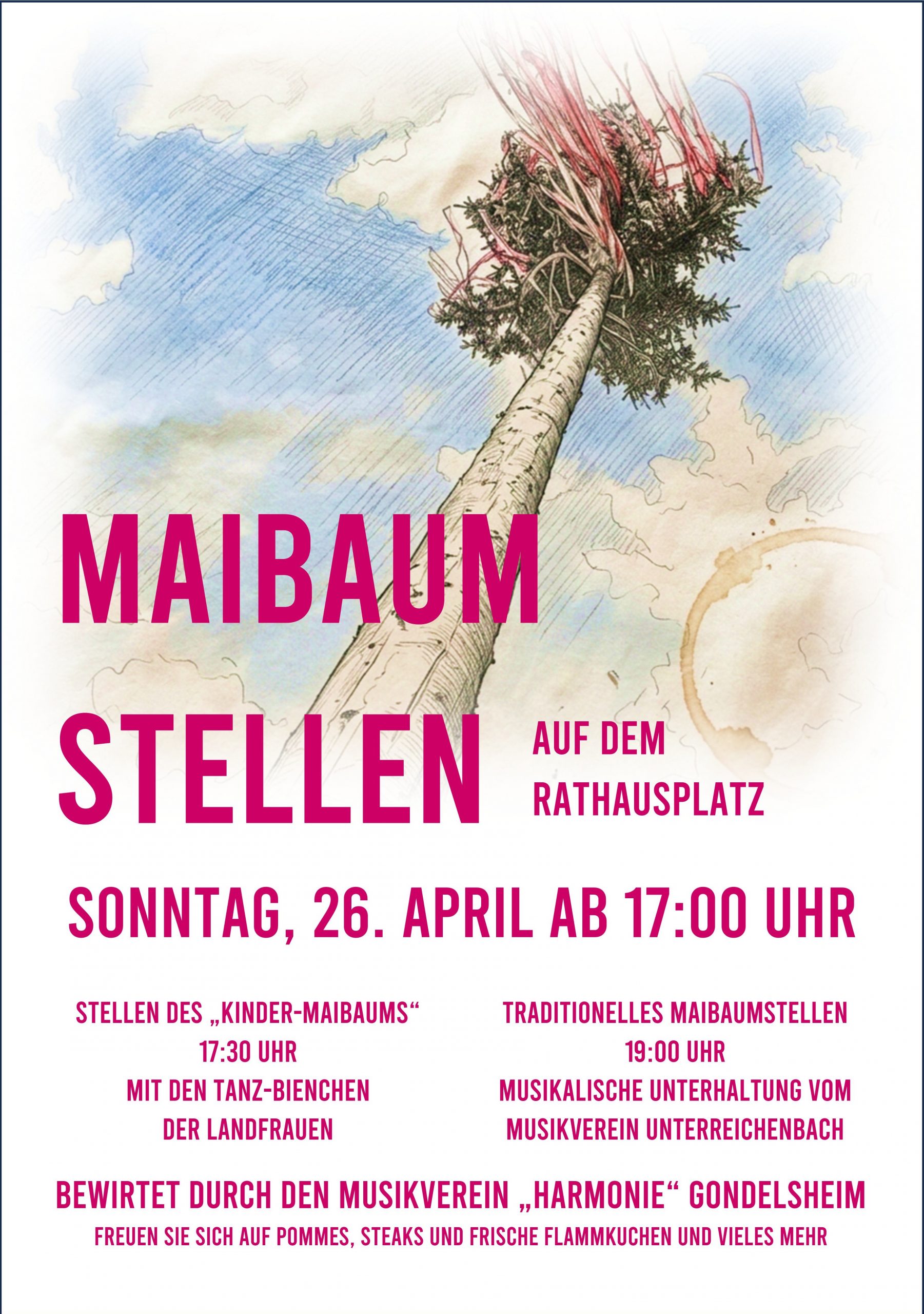 Nur einen Tag nach unserem Frühjahrskonzert dürfen wir in diesem Jahr zum ersten Mal das Gondelsheimer Maibaumstellen am Sonntag, 26. April auf dem Rathausplatz bewirten. Beginn ist um 17 Uhr.
